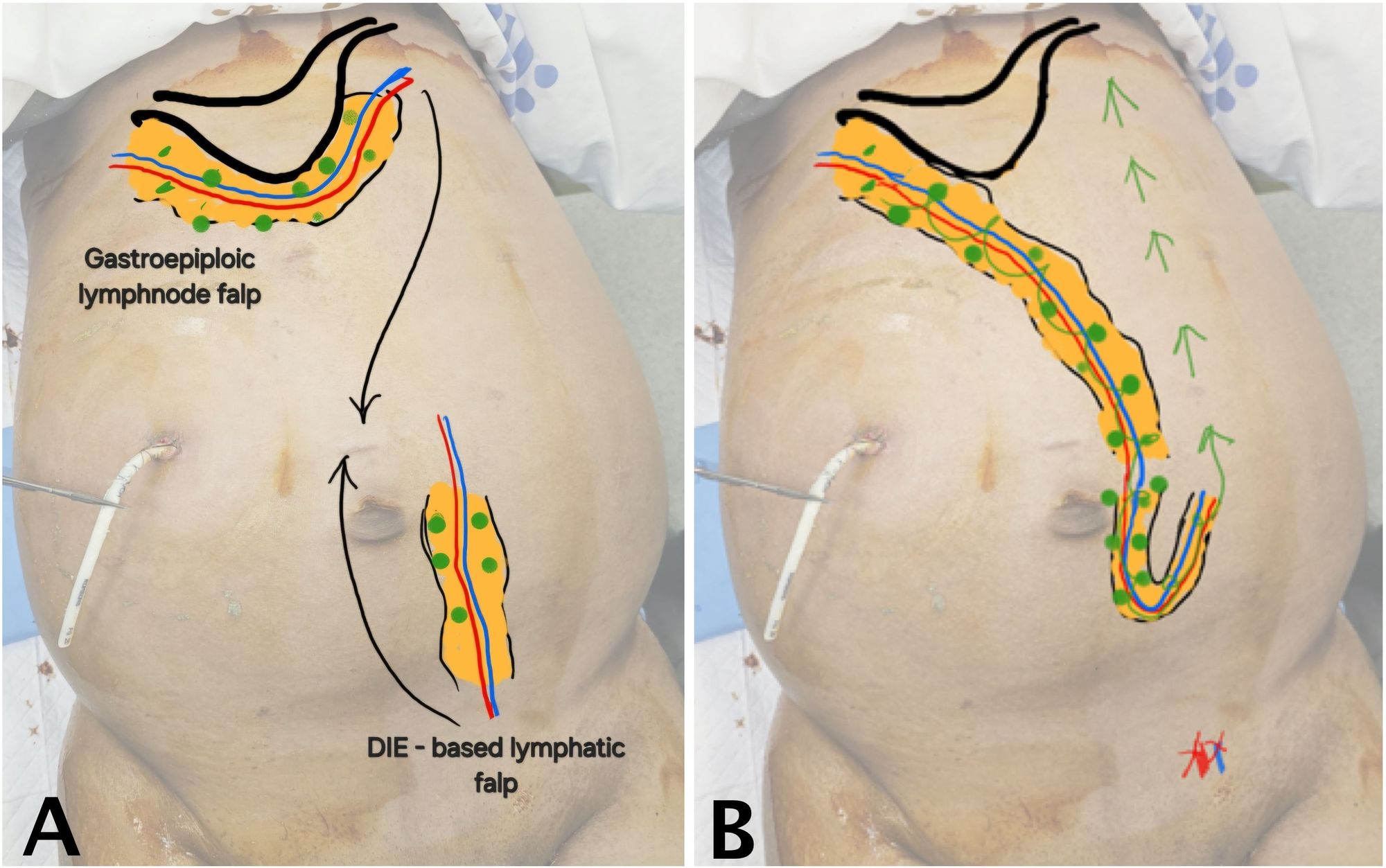 Figure 1. Schematic of DIE-GE bypass for chylous ascites. (A) Preoperative image showing the cranial GE-VLN harvested from the greater curvature of the stomach and the caudal DIE-LCF harvested from the lower abdomen, both depicted in orange. Green circles indicate lymph nodes; blue and red lines represent lymphatic channels and vascular pedicles. Arrows show the planned direction of flap transfer. (B) Postoperative image showing anastomosis of the two flaps to establish a bypass route for chylous fluid drainage into systemic circulation (green arrow). The red X marks the ligation site of the distal deep inferior epigastric vessels near the bifurcation of the external iliac vessels. Abbreviations: DIE-GE, combined deep inferior epigastric and gastroepiploic; DIE-LCF, deep inferior epigastric lymphatic cable flap; GE-VLN, gastroepiploic vascularized lymph node flap.