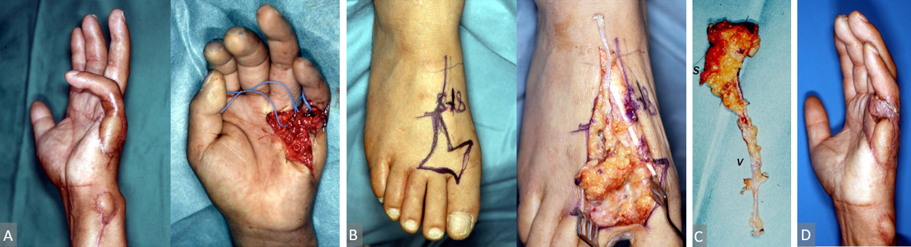 Figure 3. (A) Case 3, a 59-year-old man with a severe volar scar contracture of the left little finger. Right, the contracture was released. (B) A free flap with a short segment of 1st MTA was elevated on the right foot dorsum. Left, flap design. Right, the deep peroneal nerve was preserved. (C) A short segment (marked as S) of the 1st MTA and dorsal cutaneous vein (marked as V) of the flap were included in the flap and anastomosed to the ulnar digital artery of the ring finger and dorsal cutaneous vein of the hand. (D) Three months after surgery. The flap survived completely. 1st MTA, first metatarsal artery.