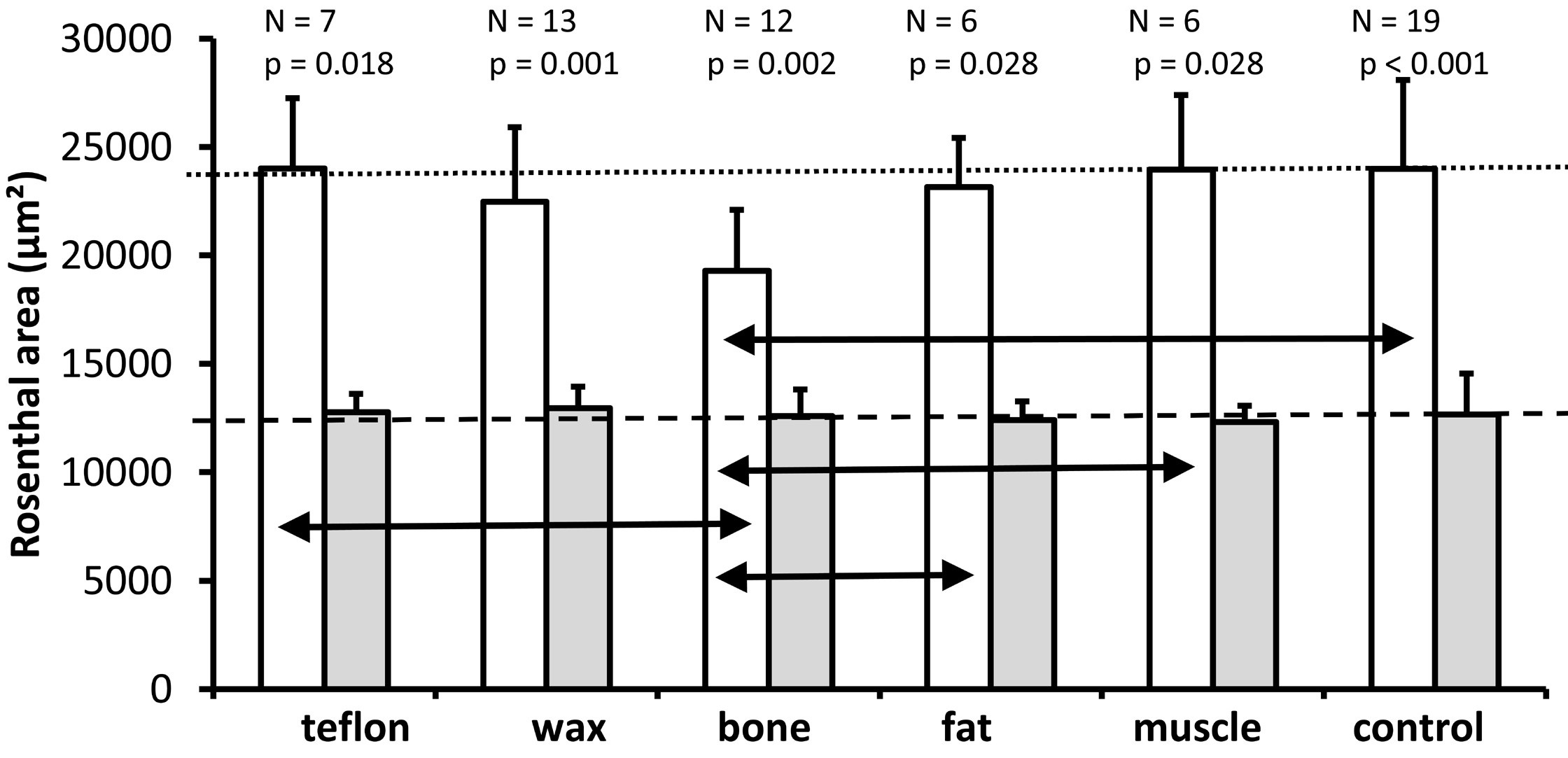 The analysis of the 6 groups (Kruskal Wallis test) revealed a significant effect of treatment on the cross-sectional area of Rosenthal's canal only for the lower basal turn (P = 0.010), but not for the upper basal turn (P = 0.819). A further analysis of pairwise comparisons (Mann Whitney U Test) of the lower basal turn (double arrows in Figure 6) revealed that the bone group (mean = 19282 µm²) had a significantly smaller cross-sectional area of Rosenthal's canal compared with the control group (mean = 23984 µm², P <0.001), fat (mean = 23148 µm², P = 0.024), muscle (mean = 23958 µm², P = 0.005) and Teflon (mean = 24004 µm², P =0.010). The difference between the bone and wax groups failed to reach significance (mean = 22464 µm², P = 0.060). None of the other pairwise comparisons between materials was significant (all P >0.05).