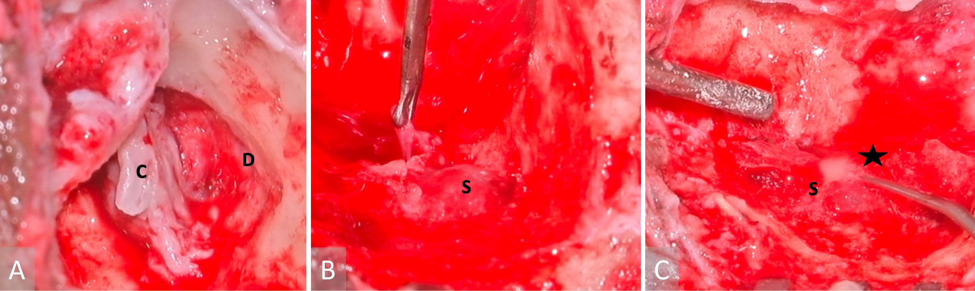Figure 3. Images obtained during surgery. (A) A cholesteatoma is present in the left middle ear (labelled with a letter C), as well as a tegmen mastoideum defect and the exposed dura (indicated with a letter D). (B) A sigmoid sinus that has been exposed (marked with a letter S), while granulations have been removed from the peri-sigmoid area. (C) Purulence in the sigmoid sinus (indicated with a letter S) observed during instrumentation of the peri-sigmoid region (marked with a star).