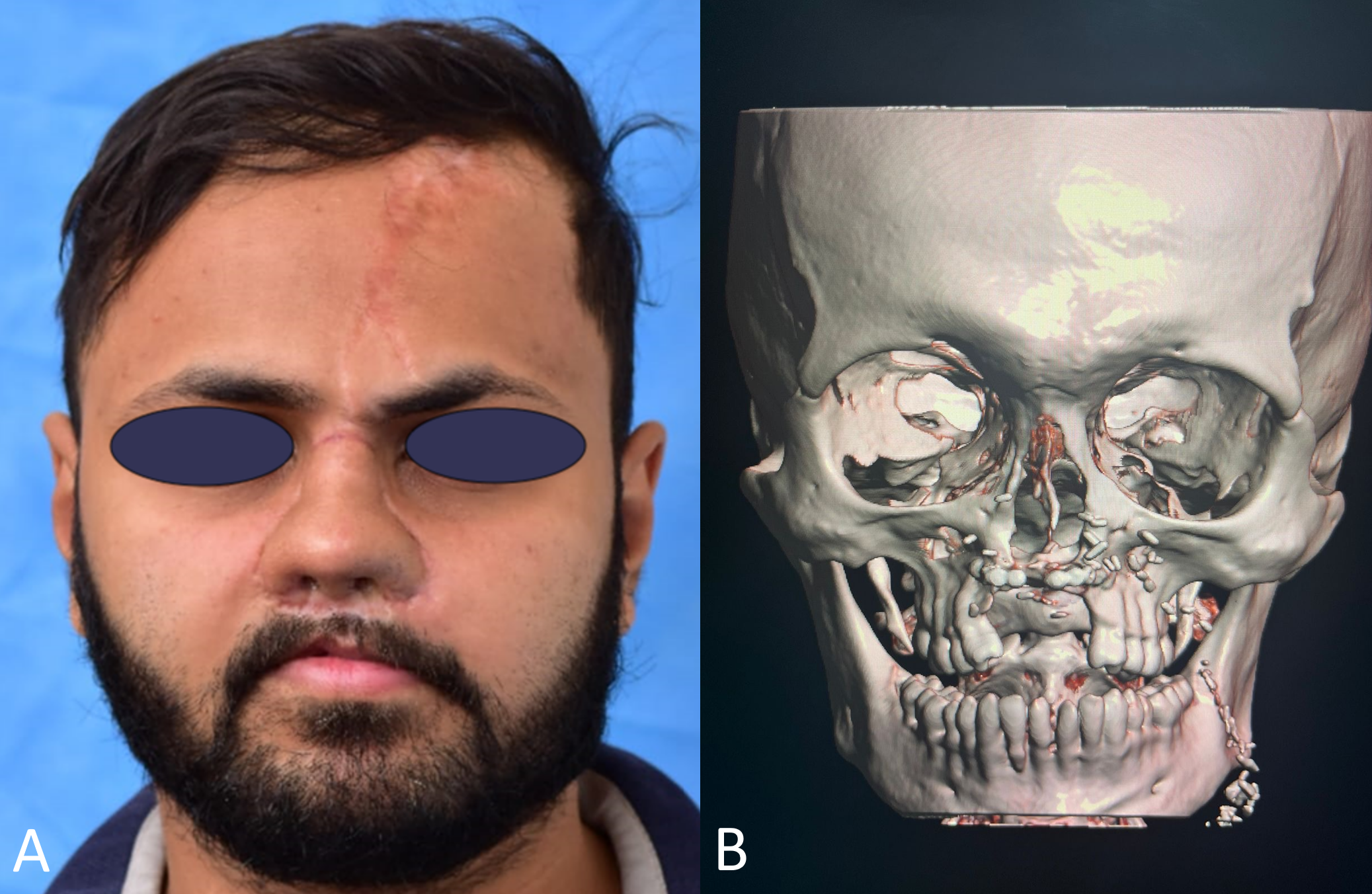 Figure 5. Postoperative outcomes and computed tomography evaluation six months following the completion of all stages of nasal reconstruction utilizing the tubularized radial artery forearm flap (RAFF) technique. (A) After the division and inset of the forehead flap pedicle, the patient exhibits well-healed surgical sites and a symmetrical nasal structure. This view captures the results following the completion of all nasal reconstruction stages, with the forehead flap pedicle seamlessly integrated and without visible complications. (B) A three-dimensional reconstructed computed tomography scan of the skull demonstrates the successful integration of the radius bone into the central maxilla, confirming stable bone healing and the absence of complications in the reconstructed nasal and maxillary structures.