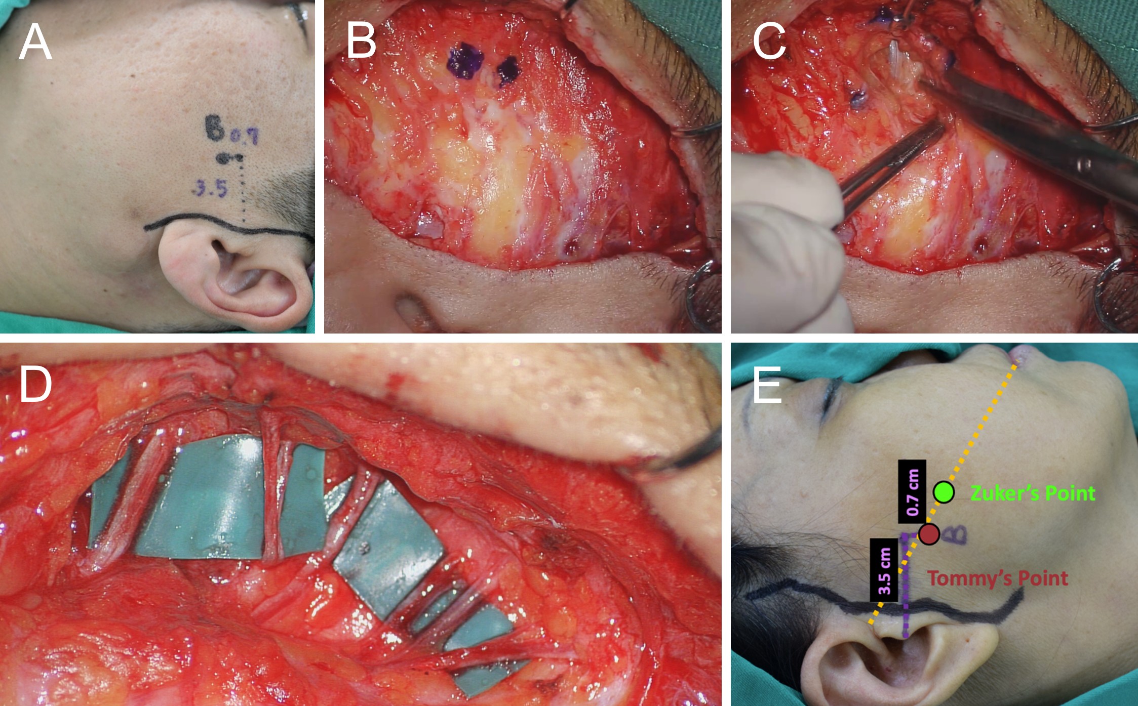 Zuker’s point [4], a surface landmark located midway between the root of the helix and the oral commissure, is widely used to identify the middle division of the facial nerve responsible for smile function. While this landmark provides consistent identification of the target branch, its distal location necessitates retrograde dissection when additional zygomatic or buccal branches require exploration, thereby increasing operative complexity.